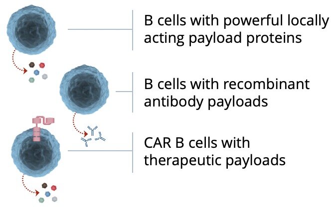B cells and their progeny are known to be good producers of antibodies. Walking Fish utilizes the protein production capabilities of B cells by engineering B cells to produce proteins as therapeutics. Walking Fish B cells are directed to specific tissues or homed to their “native” tissues.